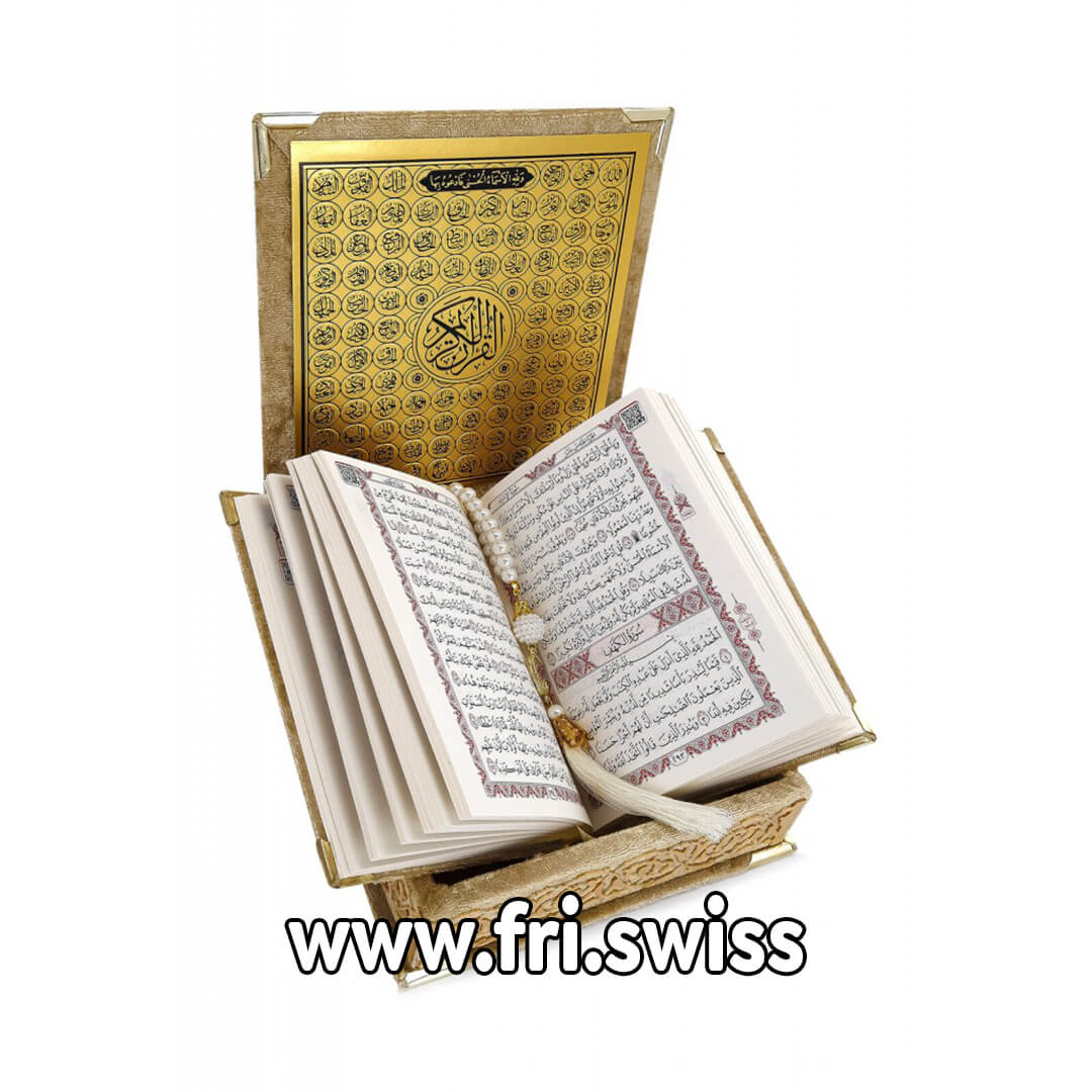 Kuran Arabisht me kuti druri prej materiali te safirit. Vie së bashku me tespih prej perle. Kjo është një dhuratë ideale për familjarët dhe shoqërinë.