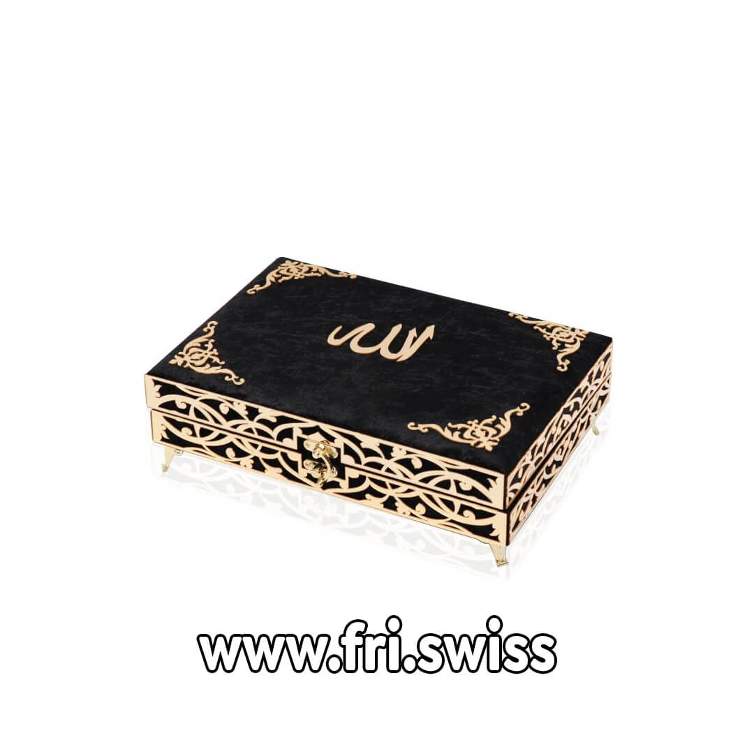 Kjo kuti është një set i mrekullueshem për dhuratë ideale. Kutia përmban Kuran së bashku me tespih dhe sexhade. Kurani është në gjuhën Arabe. Modeli i prerë i pasqyruar me pleksiglas me fjalët e Allahut. Mbuluar posaçërisht me pëlhurë luksoze prej kadifeje. Të gjithë Kuranët e mbuluar me kadife kanë hekura mbrojtës në qoshe që parandalojnë dëmtimin e faqëve dhe sigurojnë që pëlhura e mbuluar prej kadife të mbetet e qëndrueshme.