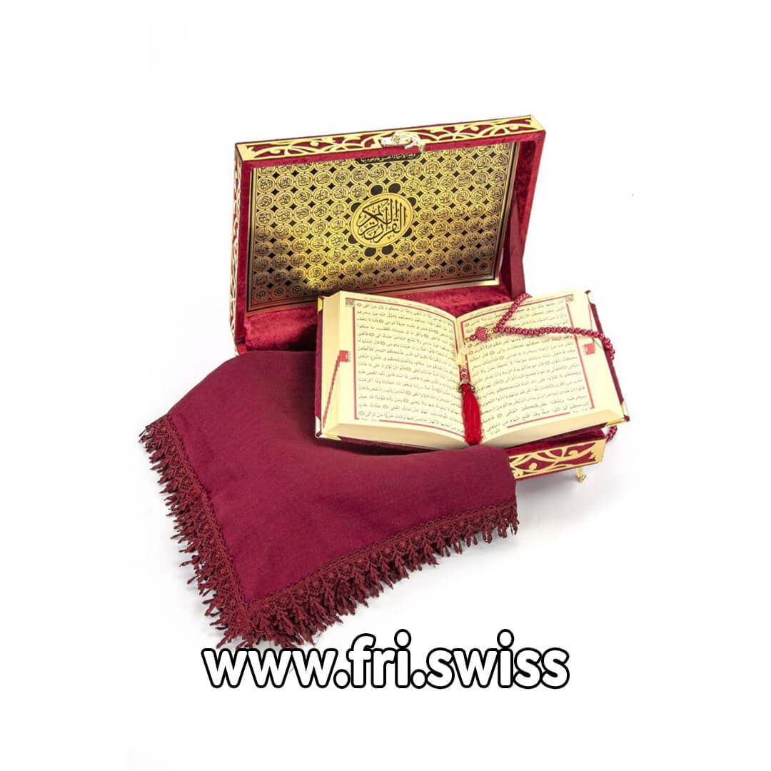 Kjo kuti është një set i mrekullueshem për dhuratë ideale. Kutia përmban Kuran së bashku me tespih dhe sexhade. Kurani është në gjuhën Arabe. Modeli i prerë i pasqyruar me pleksiglas me fjalët e Allahut. Mbuluar posaçërisht me pëlhurë luksoze prej kadifeje. Të gjithë Kuranët e mbuluar me kadife kanë hekura mbrojtës në qoshe që parandalojnë dëmtimin e faqëve dhe sigurojnë që pëlhura e mbuluar prej kadife të mbetet e qëndrueshme.