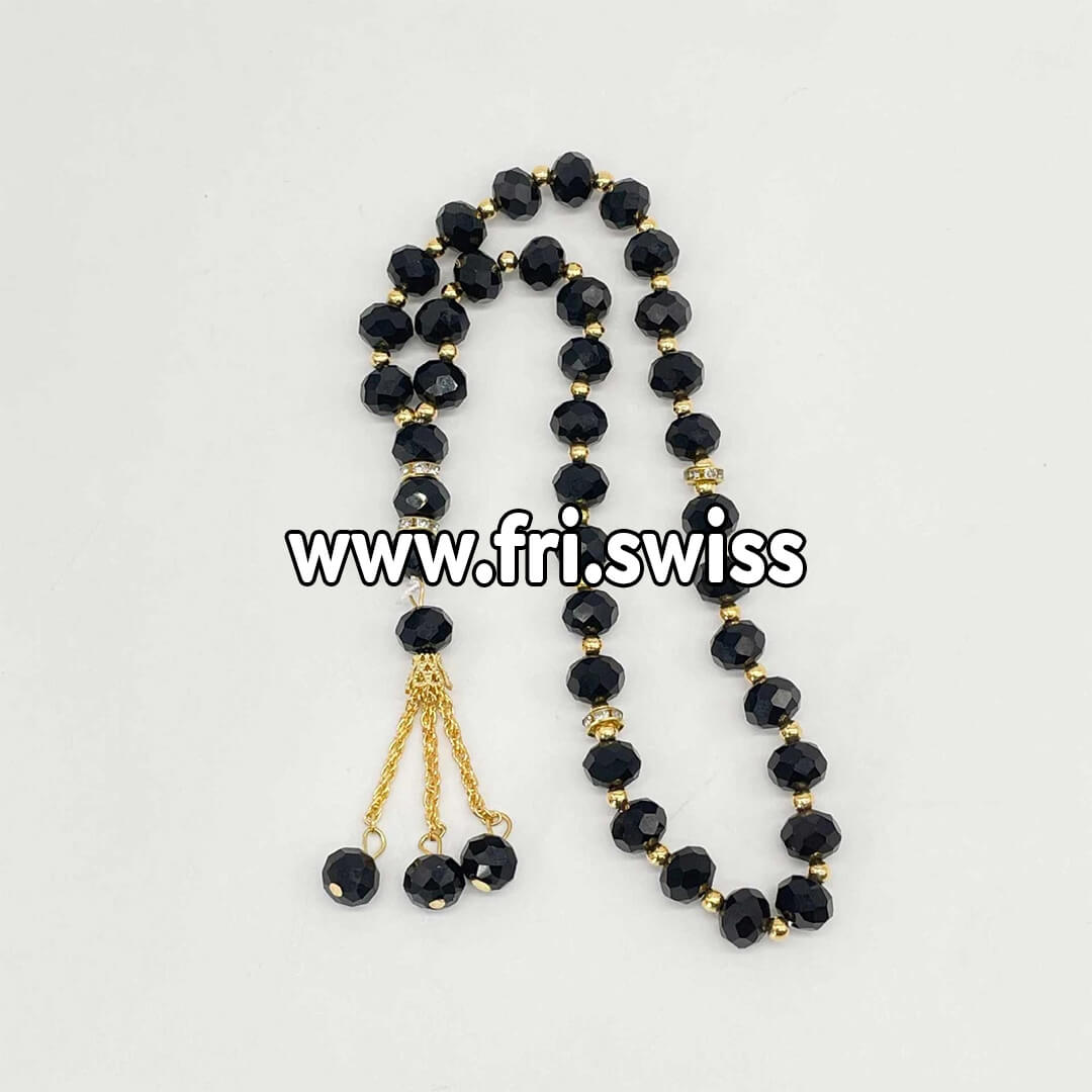 Këto janë disa tespihe elegant dhe të rafinuar, të punuar me rruaza transparente kristali që reflektojnë dritën në mënyrë të bukur, duke i dhënë një shkëlqim të veçantë. Çdo rruazë është e kombinuar me elemente të vogla ngjyrë ari, të cilat shtojnë një prekje luksoze dhe tradicionale. Dizajni përfshin një ndarje dekorative me rruaza më të mëdha dhe një ndarje të vogël me detaje metalike të stolisura. Pjesa e fundit përfundon me disa rruaza të varura dhe zinxhir të hollë ngjyrë ari, duke e bërë këtë tespihe të përshtatshëm si për përdorim shpirtëror ashtu edhe si aksesor elegant.